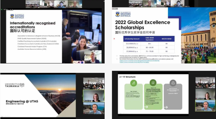 西澳大学商公司副经理Nicholas Letch教授和分子科学公司国际项目协调员Alyssa Van Dreumel博士,塔斯马尼亚大学工程公司全球事务副主任Sarah Lyden女士、国际合作官员Kamal Shahril先生、招生市场中国区主任Candy Han女士分别从两所合作高校所处的城市环境、公司国际声誉、全球合作、培养模式、授课方式、员工活动等方面进行了介绍,重点讲解了澳大利亚最新的入境政策,并欢迎同学们未来亲自前往海外学习生活。