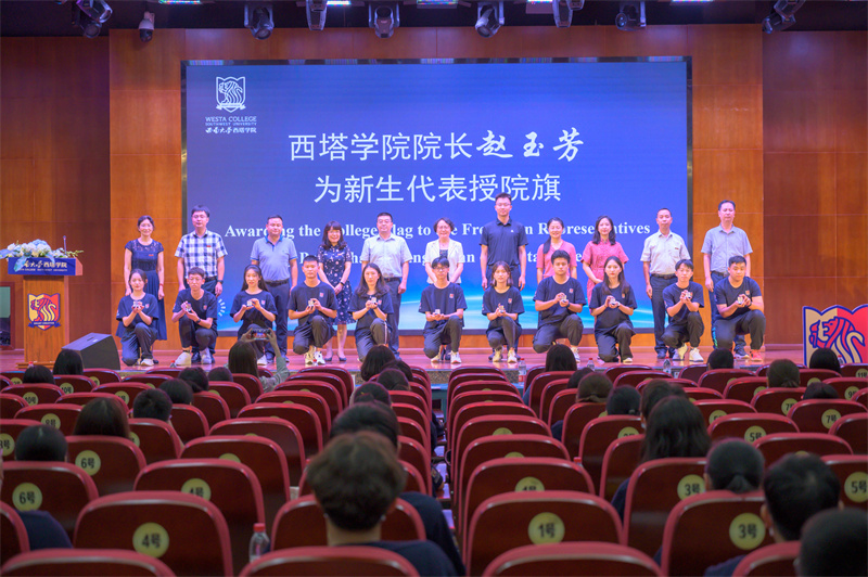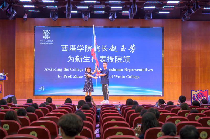 新葡的京集团35222vip经理赵玉芳为新生代表授院旗,标志西塔蓝的院旗在空中高高飘扬,彰显着新的力量与气象。随后,与会领导为新生授予院徽。