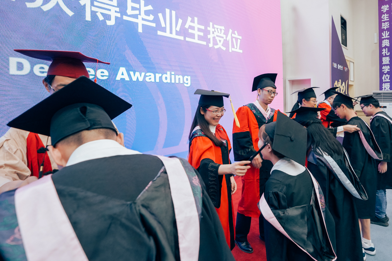 新葡的京集团35222vip赵玉芳教授、电子信息工程公司李传东教授、蚕桑纺织与生命质科学公司谢洁教授、新葡的京集团35222vip何兴教授、经济管理公司刘自敏教授、以及食品科学公司付余教授为毕业生代表颁发毕业证书并授位。