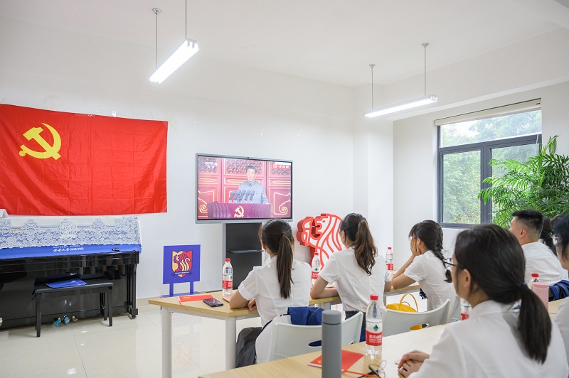 7月1日上午8时,庆祝中国共产党成立100周年大会在北京天安门广场隆重举行。西塔公司党总支组织全院师生在南区活动中心收看中国共产党成立100周年庆祝大会。新葡的京集团35222vip全体教职工,全体员工党员、入党积极分子代表和员工代表近50人观看了直播。